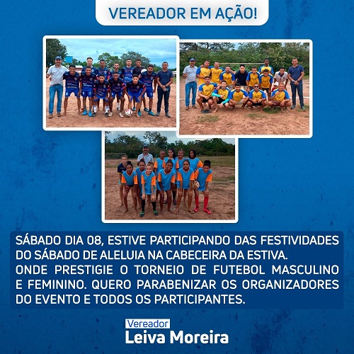 Data Publicação - 2023-04-11Vereador em AçãoSábado dia 08, estive participando das festividades do sábado de aleluia na Cabeceira da Estiva. Onde pude prestigiar o torneio de futebol masculino e feminino. Quero parabenizar os organizadores do evento e todos os participantes. |